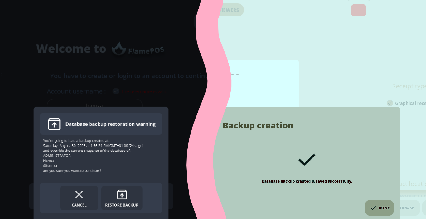 With FlamePOS, your data is always safe*. All sales, inventory, and customer records can be manually backed up and restored at any time, giving you full control and peace of mind.